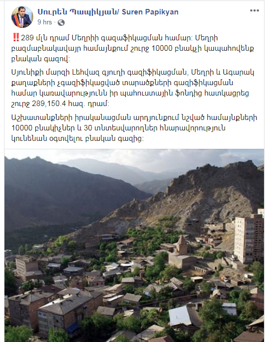 Հիմա, ըստ համայնքապետի, պետք է լուծվի գազի՝ Վահրավարի բաշխիչ կայանից Մեղրի հասցելու հարցը, որ արդեն բոլորը գազն ունենան: Նա հույս հայտնեց, որ Մեղրիի ամբողջական գազաֆիկացման հարցը վերջնականապես կլուծվի կառավարության ֆինանսական աջակցությամբ: